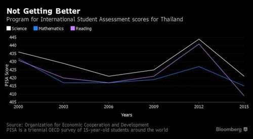 "Bất cứ điều gì chúng tôi từng làm đều không mang lại kết quả", ông Teerakiat chia sẻ. Điểm số của học sinh trong môn toán, khoa học và văn của Thái giảm mạnh kể từ cuộc khảo sát 2012, xuống thấp hơn mức trung bình quốc tế.